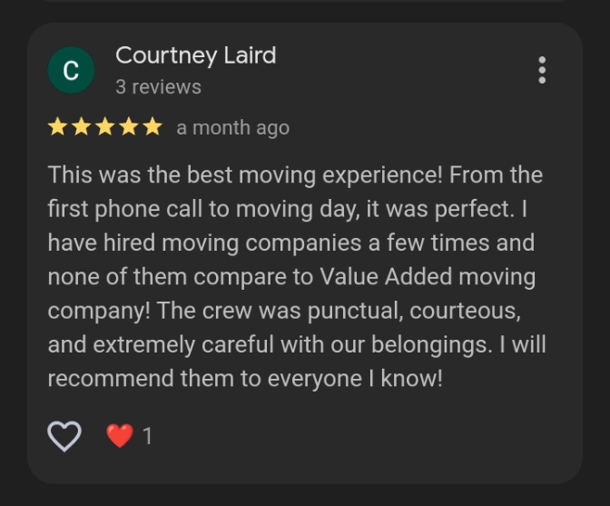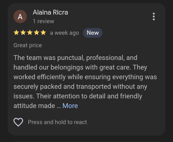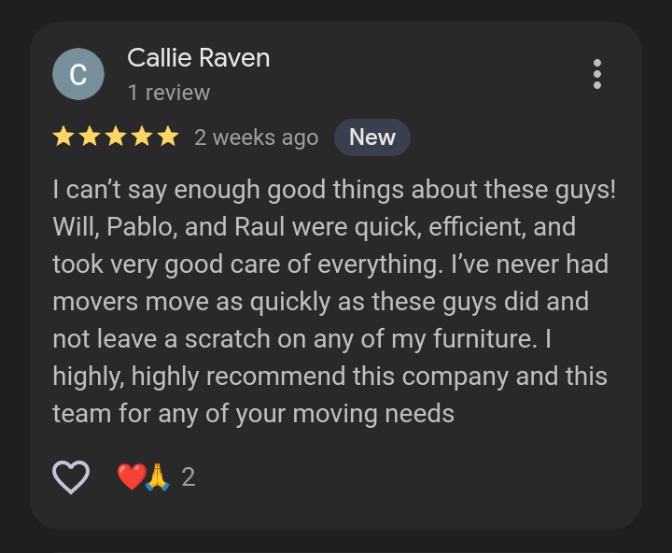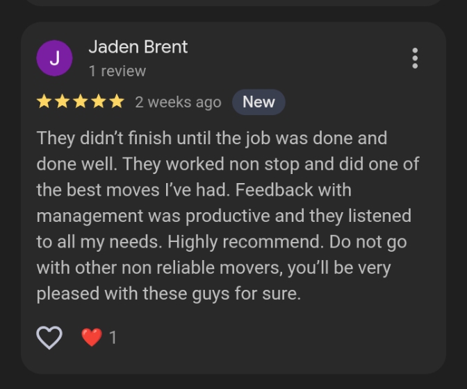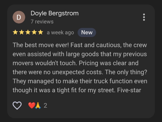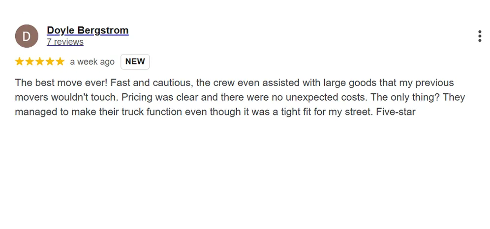 We carefully vet every mover in our network, checking for proper licensing, insurance, and positive customer reviews. Our reputation is built on reliability, transparency, and satisfied customers. See our testimonials to learn more!